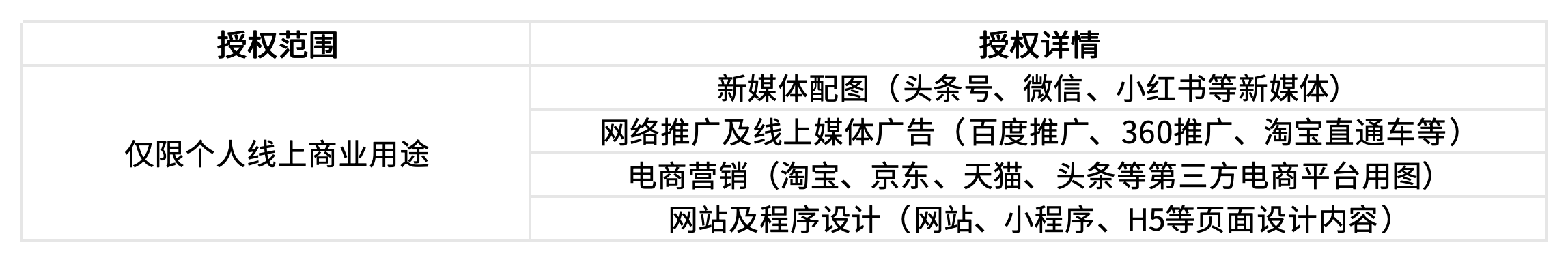 注意:在会员模式下,如设计成品中包含用户自行添加的素材,或者笔格设计提示须由用户自行获得授权的素材,用户需保证上述素材已获得与上表同等的授权范围,否则该设计成品将视为未获得授权。