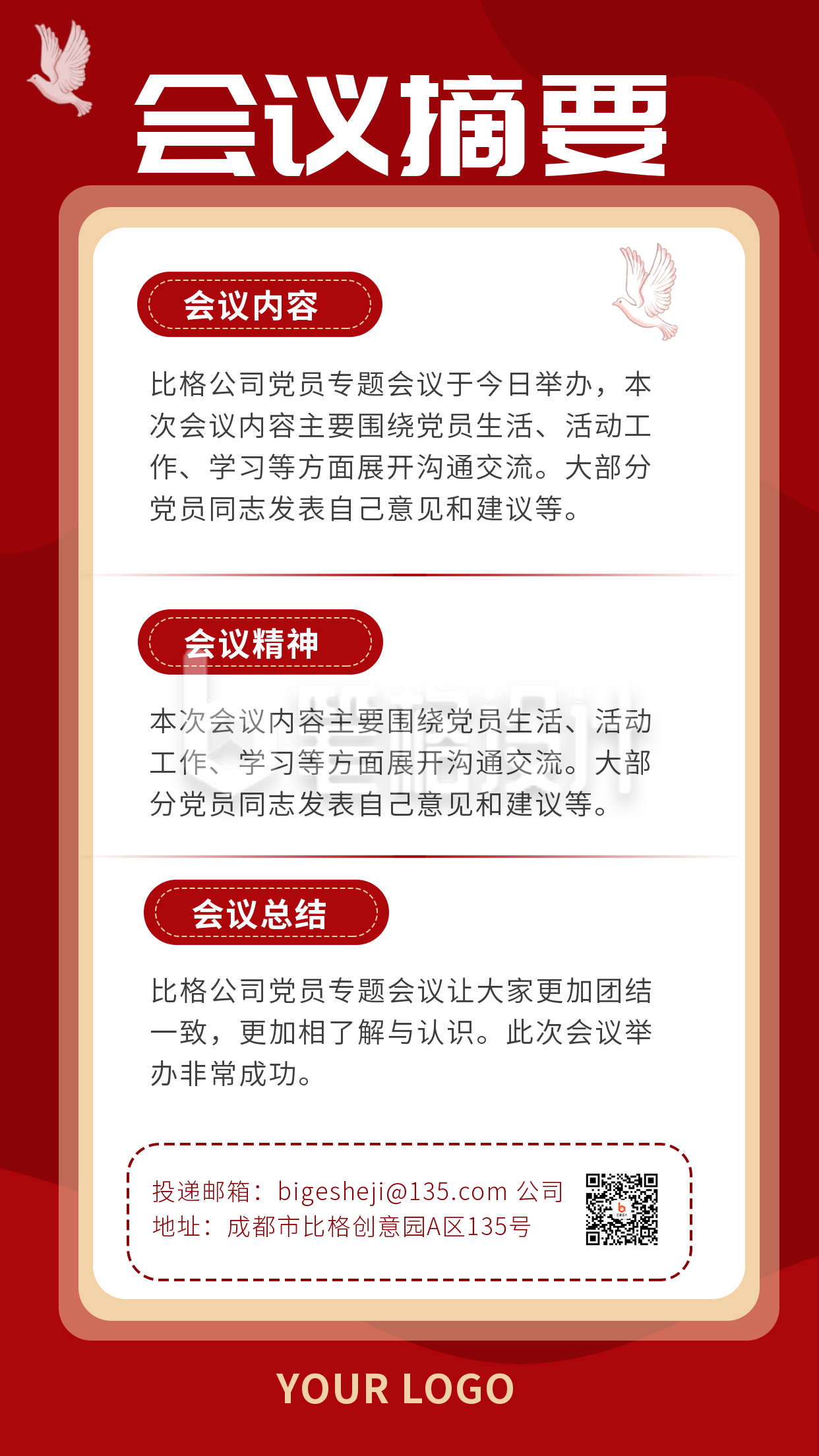 会议精神政务通知手机海报格式图片分辨率为:72dpi,尺寸为:1242 * 2208像素,图片大小为200KB,图片默认下载格式:png格式,同时也支持jpg,png,jpeg,gif,bmp格式下载。