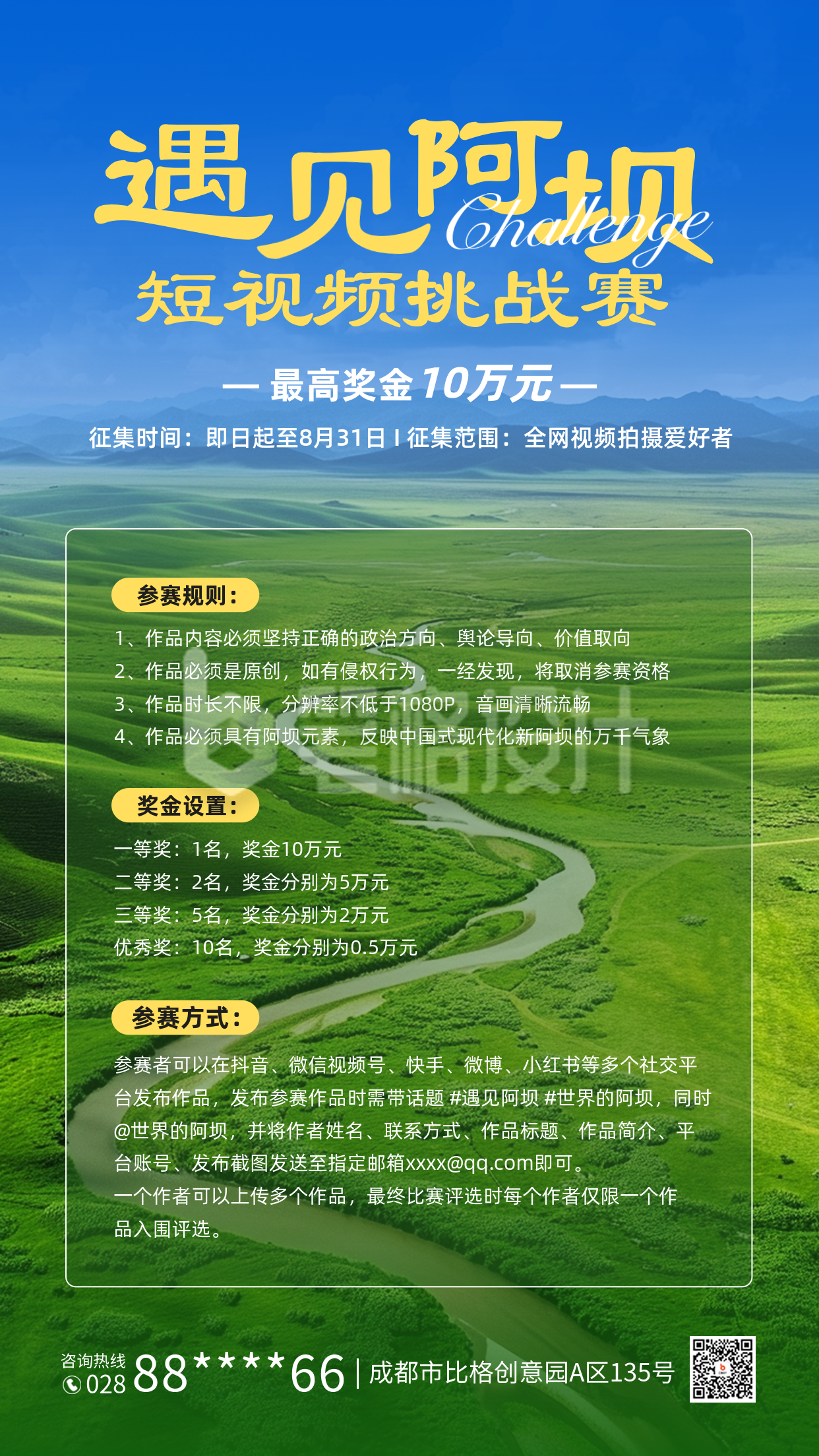 笔格设计提供精美原创的阿坝短视频宣传海报,此作品ID为:65999,主要用于手机海报方面,结合了活动宣传、实景、手绘、旅游日、旅游、度假、比赛、短视频、草原、AIGC等多个素材元素进行设计。手机海报均可商用,喜欢就点击“立即使用”,在线制作阿坝短视频宣传海报吧,1分钟即可在线高效完成设计,并能下载手机海报图片。