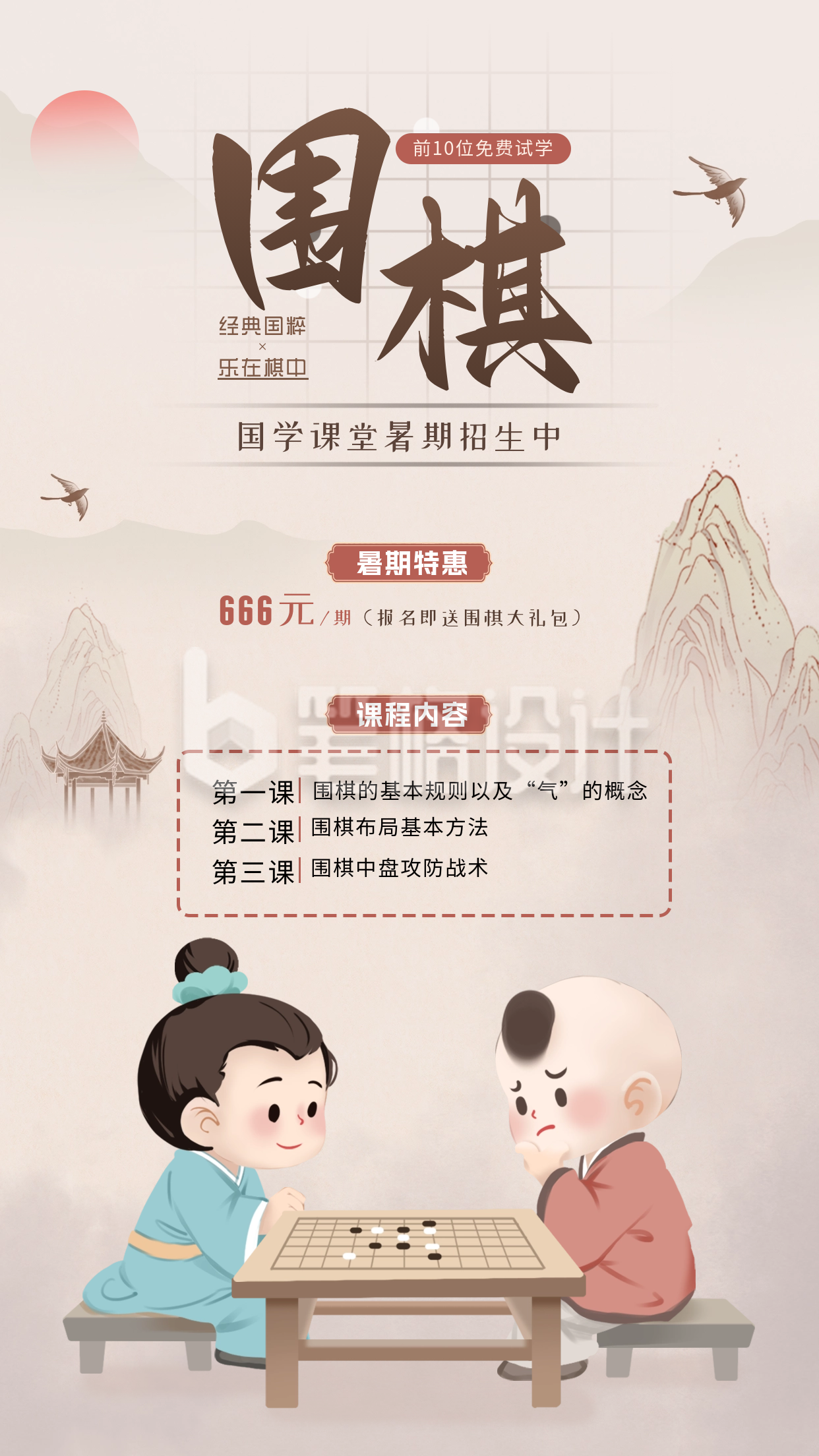 笔格设计提供精美原创的围棋课宣传促销海报,此作品ID为:67337,主要用于手机海报方面,结合了黄色、中国风、手绘、培训、暑假、招生、招生宣传、古风、山峰、儿童、围棋、山脉、亭子、暑假班、教育培训等多个素材元素进行设计。手机海报均可商用,喜欢就点击“立即使用”,在线制作围棋课宣传促销海报吧,1分钟即可在线高效完成设计,并能下载手机海报图片。