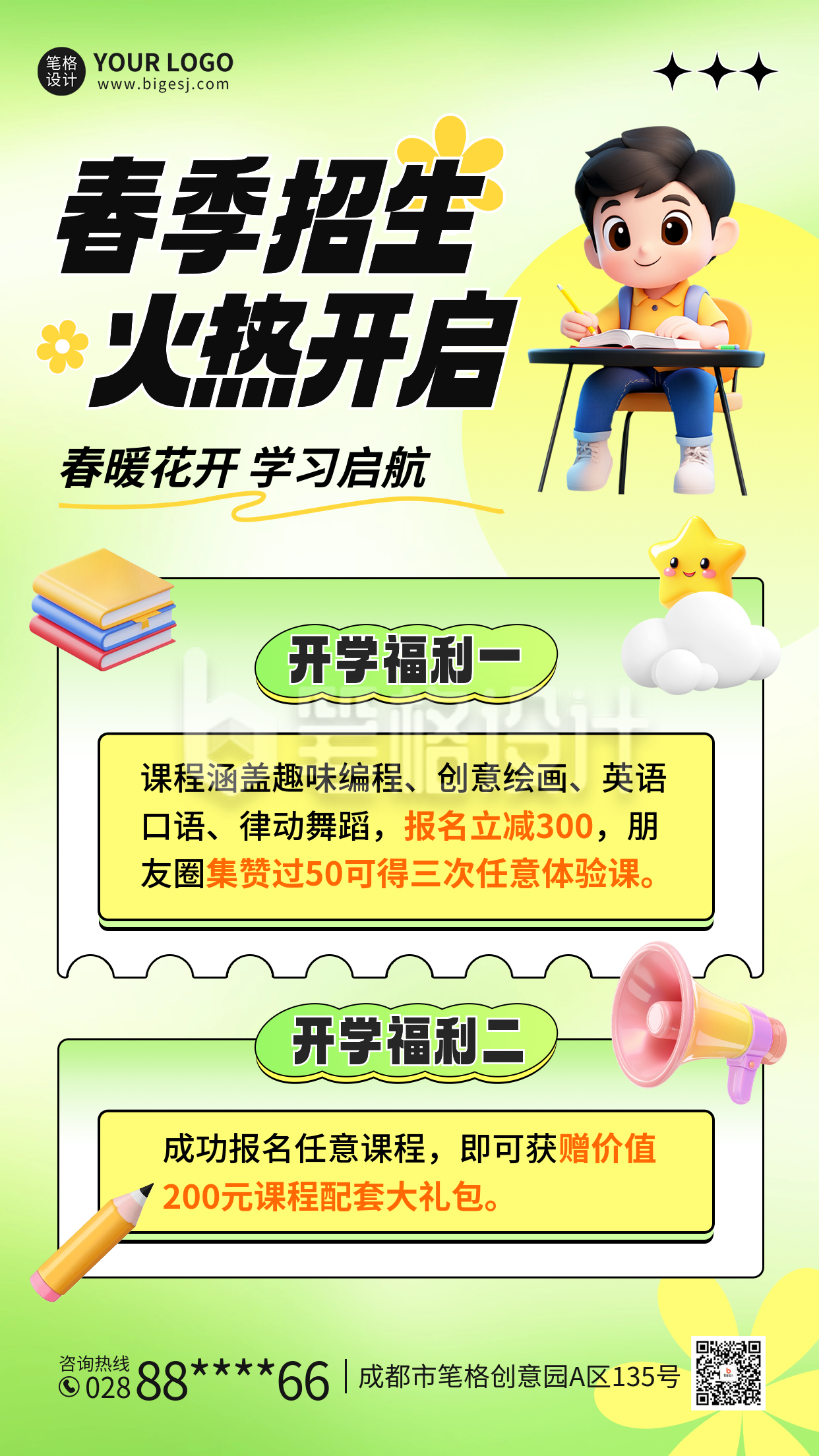 笔格设计提供精美原创的春季招生活动宣传海报,此作品ID为:75861,主要用于手机海报方面,结合了教育、培训、招生、招生宣传、小男孩、宣传、福利、喇叭、优惠、少儿教育、文具、教育培训、活动促销、AIGC等多个素材元素进行设计。手机海报均可商用,喜欢就点击“立即使用”,在线制作春季招生活动宣传海报吧,1分钟即可在线高效完成设计,并能下载手机海报图片。
